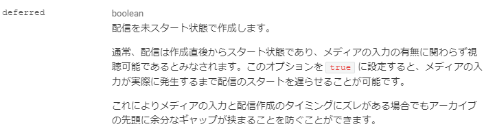 通常、配信は作成直後からスタート状態であり、メディアの入力の有無に関わらず視聴可能であるとみなされます。このオプションを true に設定すると、メディアの入力が実際に発生するまで配信のスタートを遅らせることが可能です。